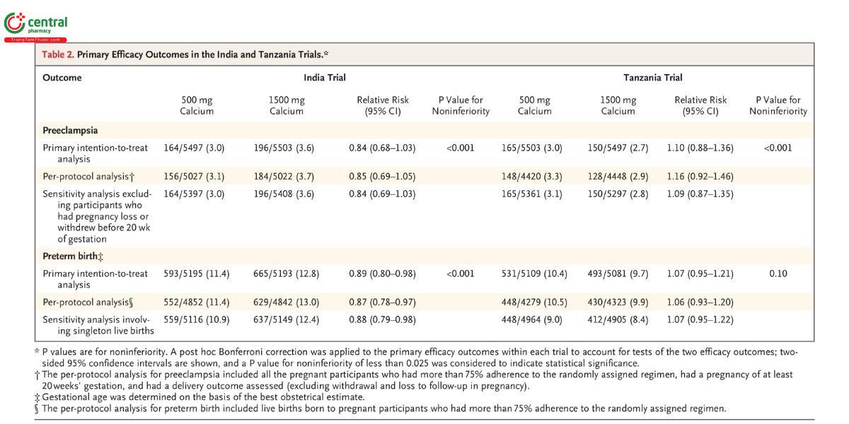 - Kết quả về tiền sản giật: Tại Ấn Độ, tỷ lệ tiền sản giật là 3,0% ở nhóm dùng 500 mg và 3,6% ở nhóm dùng 1500 mg (nguy cơ tương đối 0,84; KTC 95% từ 0,68 đến 1,03). Tại Tanzania, tỷ lệ này là 3,0% và 2,7% tương ứng (nguy cơ tương đối 1,10; KTC 95% từ 0,88 đến 1,36). Cả hai kết quả đều nằm trong biên độ không kém hơn đã định trước, cho thấy bổ sung 500 mg canxi mỗi ngày không kém hiệu quả hơn so với liều cao trong việc phòng ngừa tiền sản giật.