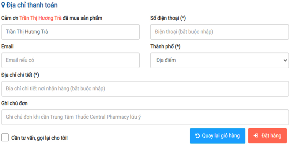 - Bước 3: Điền thông tin của bạn : tên, địa chỉ liên lạc, số điện thoại liên hệ để Trung Tâm Thuốc có thể giao hàng đến bạn.