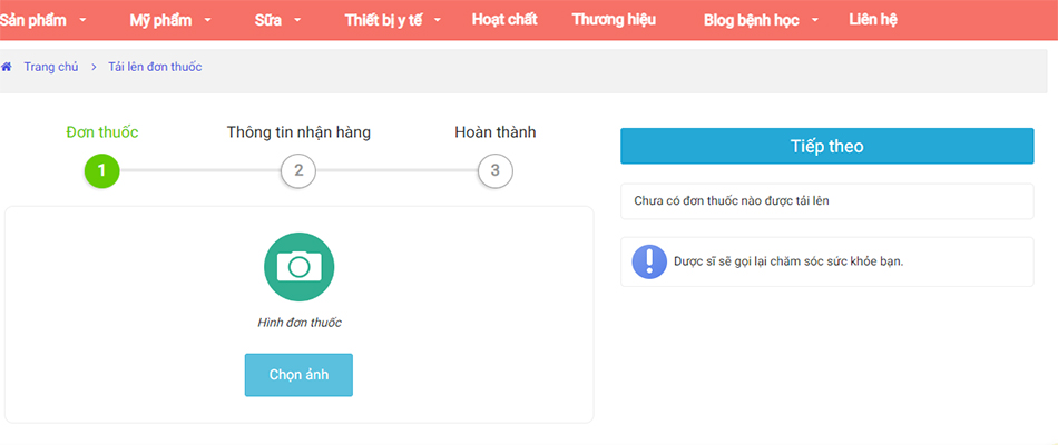 - Bước 2: Tải ảnh đơn thuốc của bạn lên và ấn vào “Tiếp theo”.