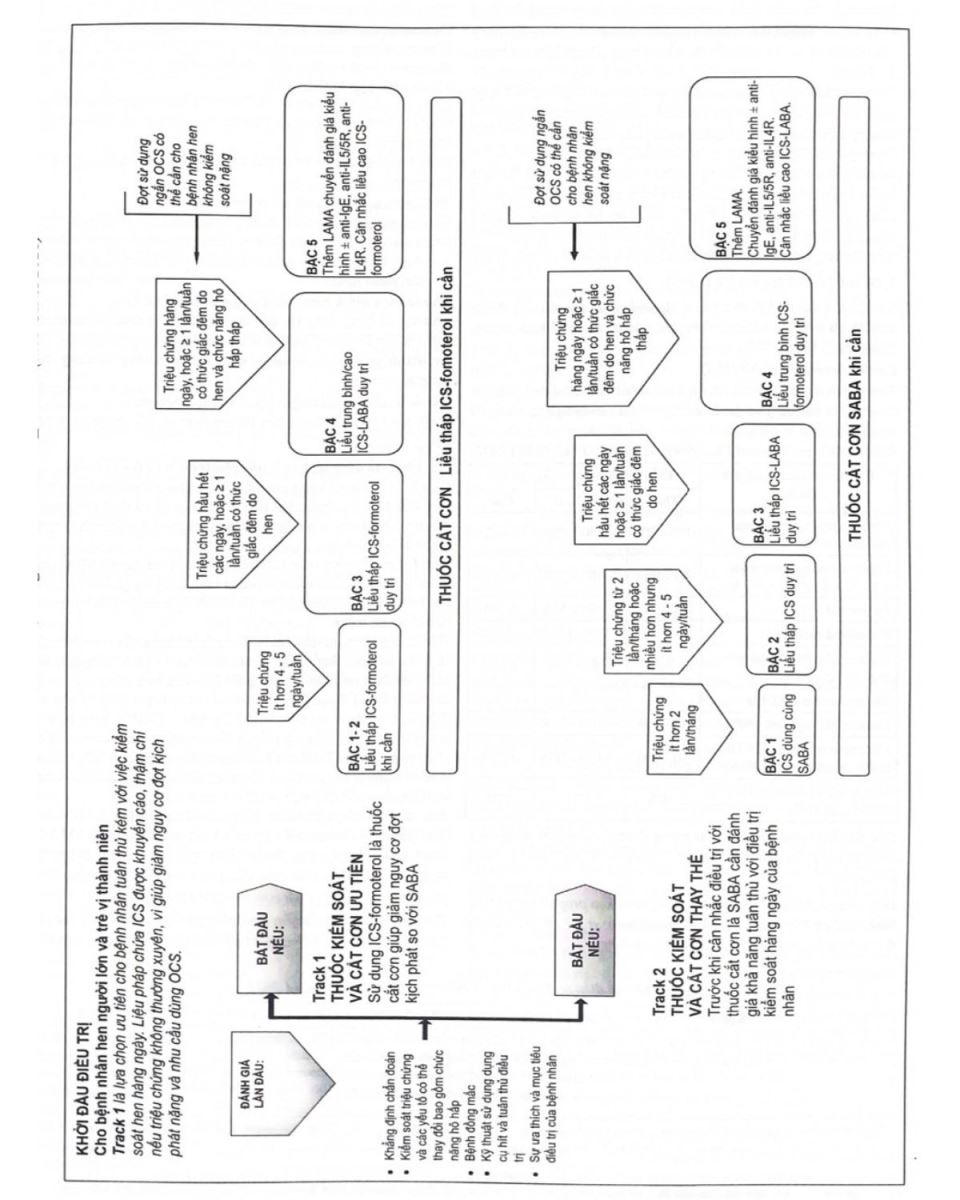 Thuốc kiểm soát ưu tiên | ICS liều thấp mỗi khi dùng SABA | Hít ICS liều thấp hàng ngày (xem bảng liều ICS cho trẻ em) | ICS liều thấp-LABA hoặc ICS liều trung bình, hoặc liều rất thấp ICS-formoterol duy trì và cắt cơn (liệu pháp SMART) | ICS liều trung bình-LABA, hoặc liều thấp ICS- formoterol duy trì và cắt cơn (liệu pháp SMART). Tham khảo chuyên gia | Tham khảo chuyên gia đánh giá kiểu hình ± liều cao ICS- LABA hoặc trị liệu bổ sung, ví dụ kháng - IgE |