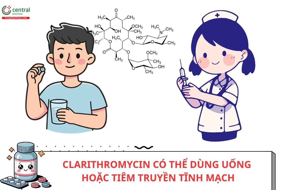 Clarithromycin có thể dùng uống hoặc tiêm truyền tĩnh mạch.