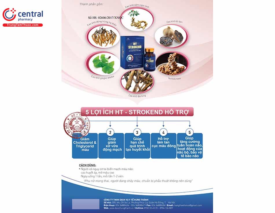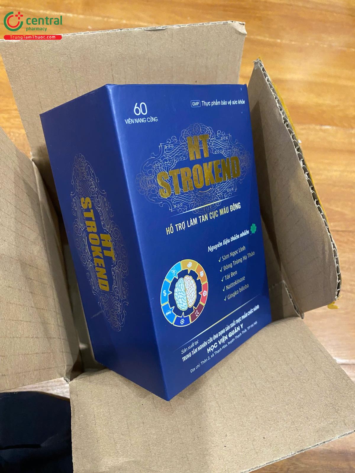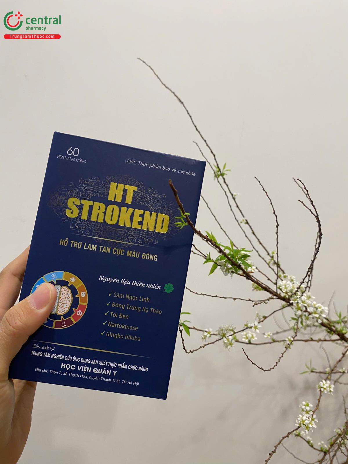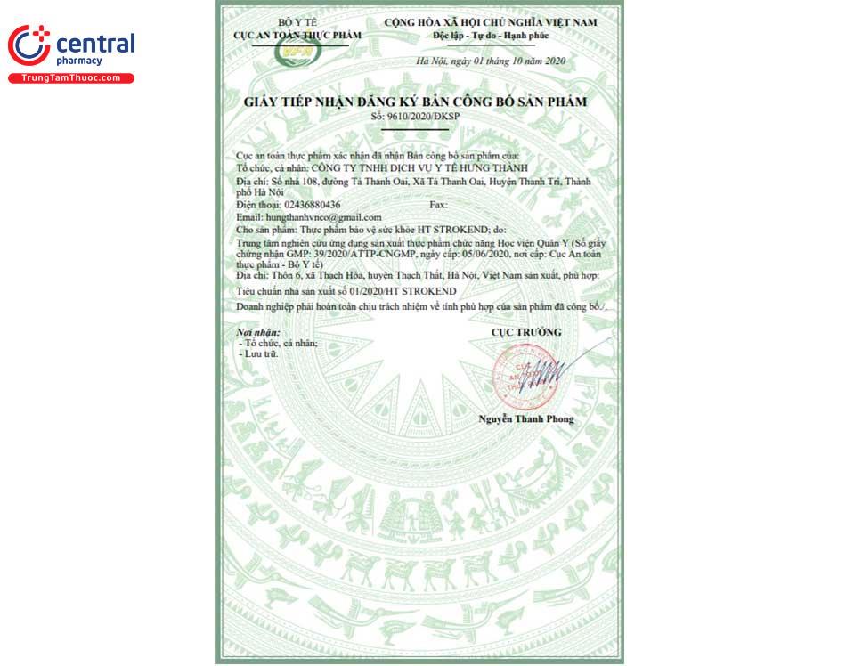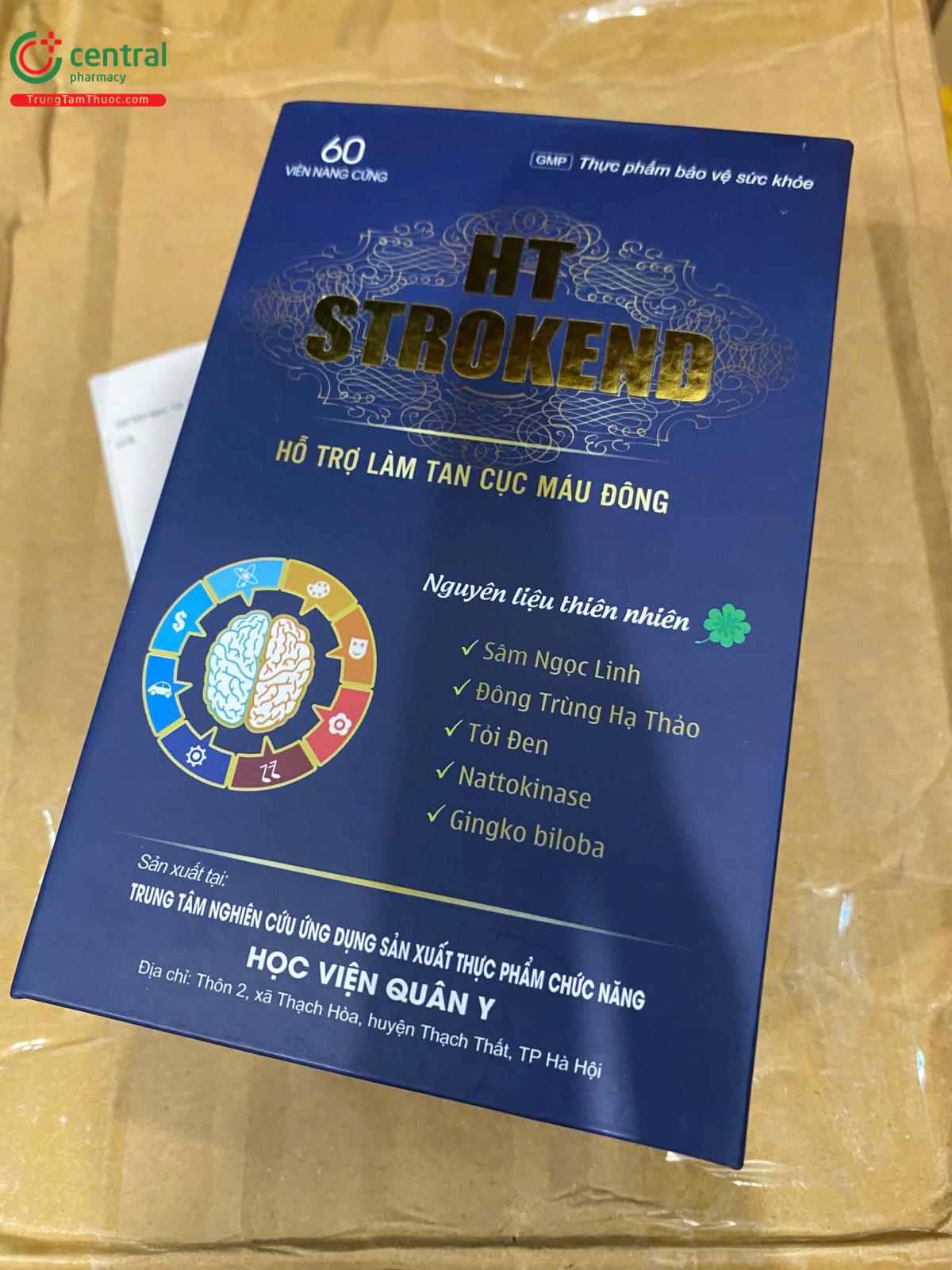 - HT Strokend là sản phẩm của Trung tâm nghiên cứu ứng dụng sản xuất thực phẩm chức năng Học Viện Quân Y, được sản xuất trên dây chuyền công nghê hiện đại, đạt tiêu chuẩn GMP, đảm bảo sản phẩm an toàn, đồng đều, ổn định về chất lượng và các tiêu chuẩn khác đã đăng ký.