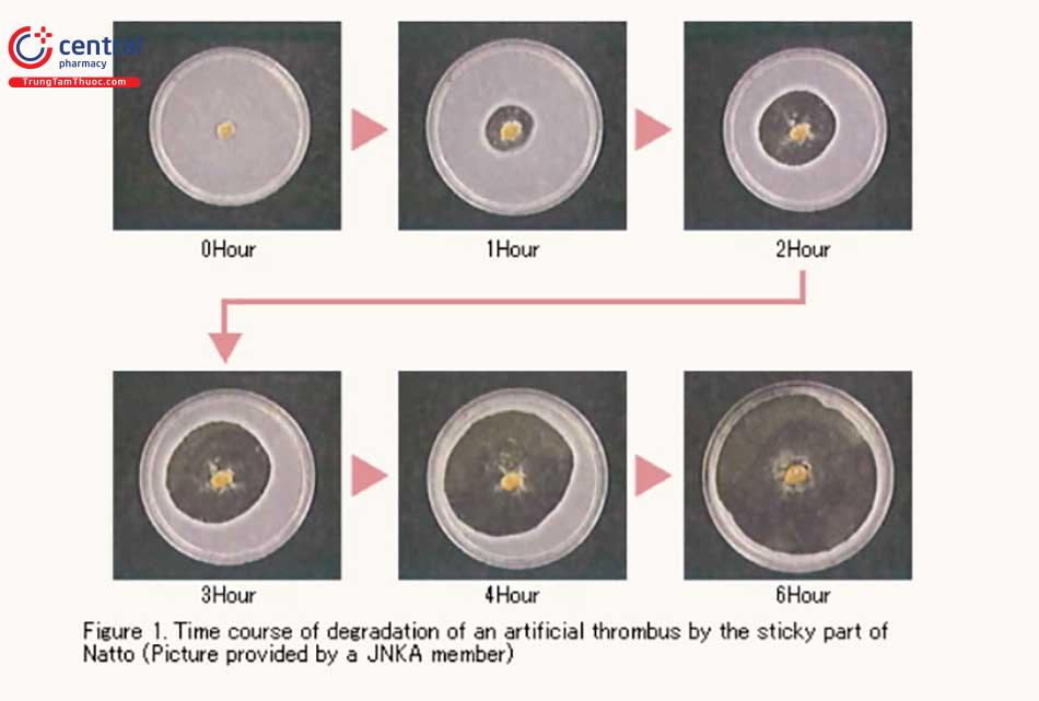 - theo Các tác dụng của Nattokinase bao gồm trực tiếp phân giải fibrin (thành phần chính của huyết khối), kích hoạt pro-urokinase (tiền chất của urokinase là một enzym làm tan huyết khối trong cơ thể) và tăng số lượng chất kích hoạt plasminogen mô (t-PA) tạo ra chất làm tan huyết khối enzim, plasmin. Ngoài ra, nghiên cứu gần đây cho thấy Nattokinase có chức năng làm suy giảm chất ức chế hoạt hóa plasminogen, PAI-1 và giảm thời gian ly giải euglobulin, do đó, nó có chức năng cải thiện hoạt động tiêu huyết khối. Hơn nữa, khả năng giảm huyết áp cũng đã được xác nhận. [3]
