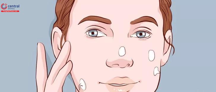 Bước 3: Chấm một lượng nhỏ kem dưỡng ẩm lên các vùng khác nhau trên khuôn mặt. Dùng các đầu ngón tay sạch để thoa từng ít kem dưỡng ẩm lên những vùng da khô chính như trán, má, mũi và cằm.