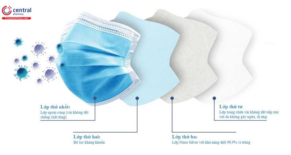 - Lớp trong cùng: lớp vải không dệt có khả năng hút ẩm, ngăn các dịch tiết ra từ miệng và mũi phát tán ra ngoài môi trường.