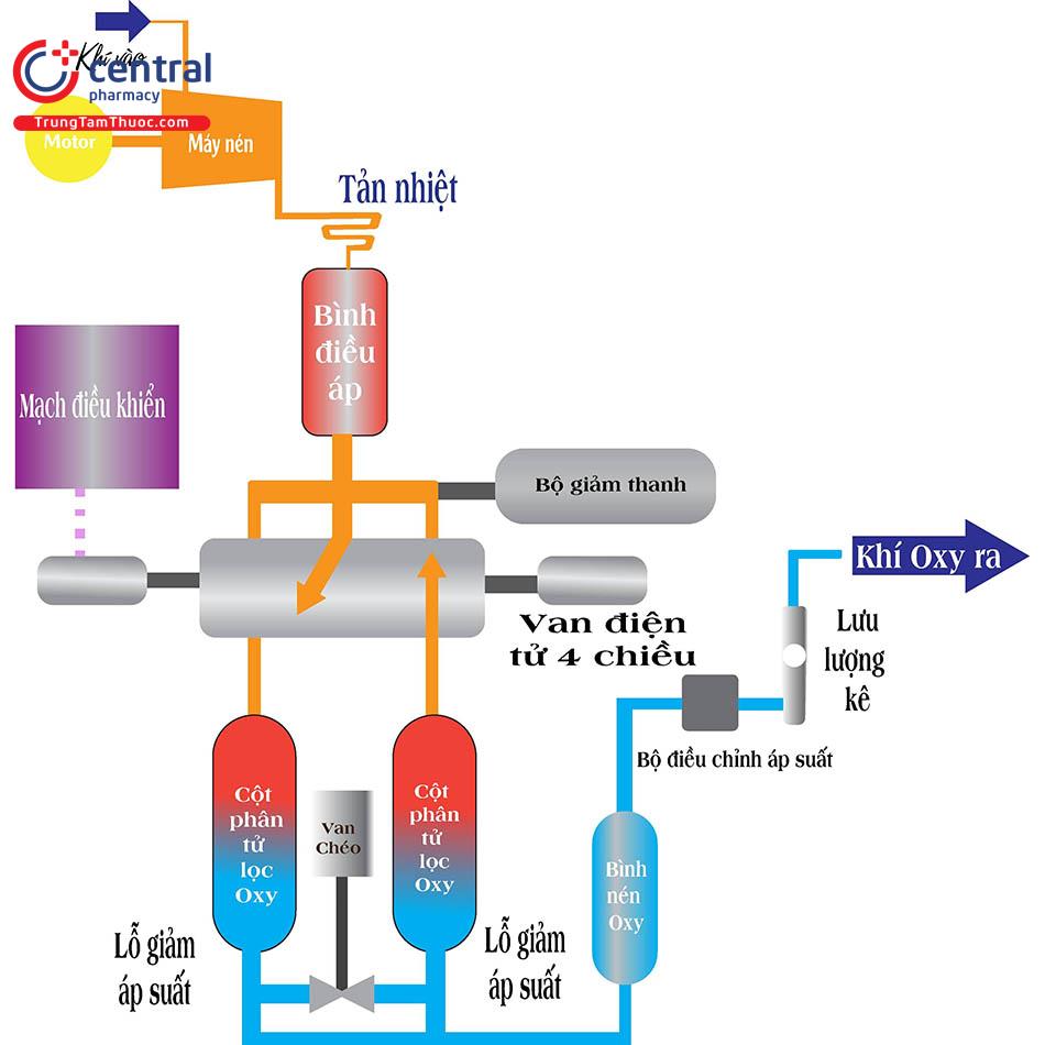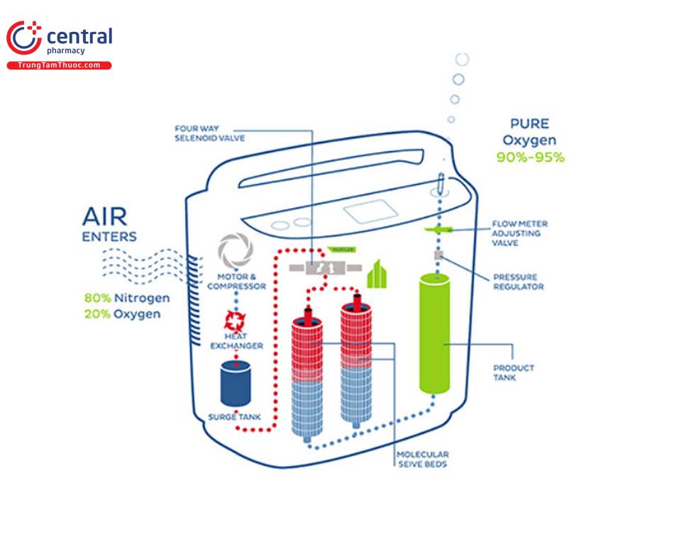 Đầu tiên, một máy nén ép không khí vào một trong hai bình chứa vật liệu sàng, chính là nơi nitơ được hấp thụ, để lại oxy đậm đặc và một phần nhỏ các khí khác có trong không khí trong phòng. Đồng thời, trong xi lanh còn lại, nitơ được khử hấp thụ bởi các hạt Zeolite và thải ra ngoài. Trong bước thứ hai, chức năng của các xi lanh được đảo ngược theo chu kỳ hẹn giờ, cung cấp một dòng Oxy liên tục cho bệnh nhân.