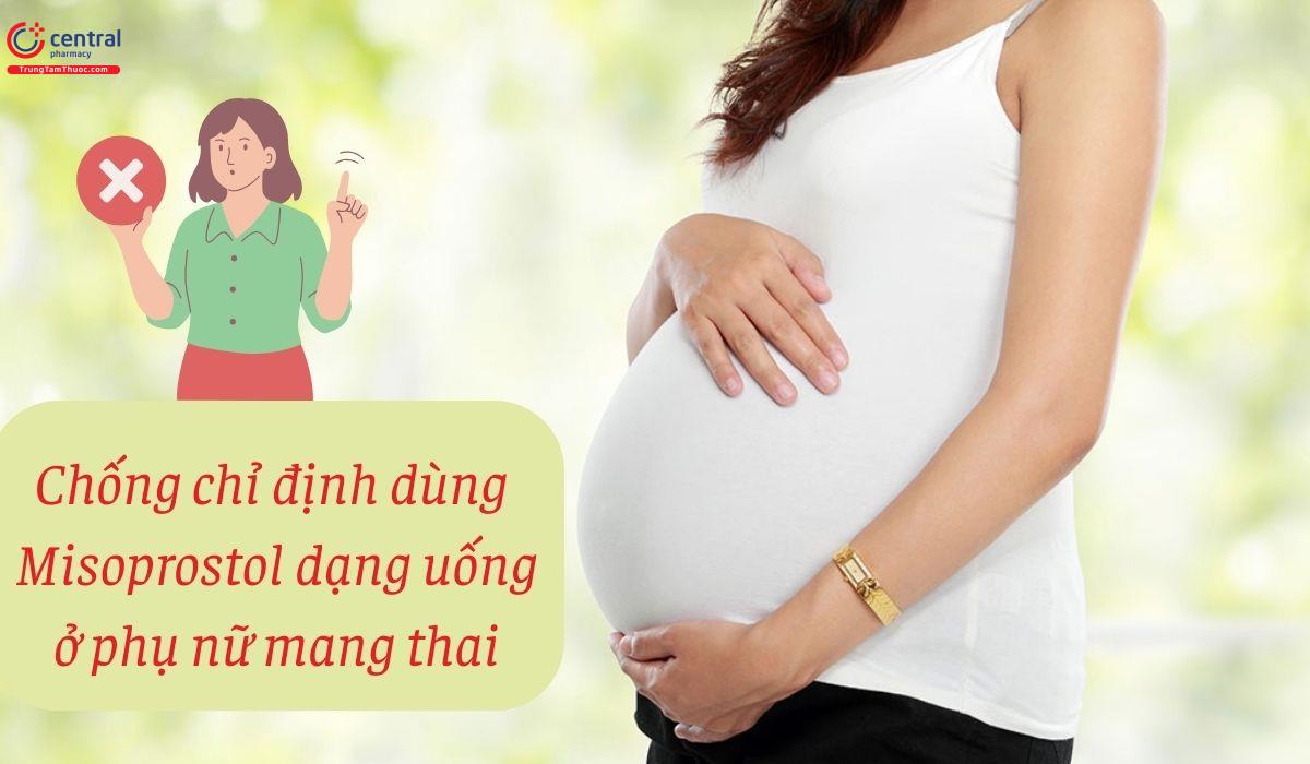 Chống chỉ định dùng misoprostol dạng uống ở phụ nữ mang thai. Misopnstol có thể gây các ảnh hưởng nghiêm trọng cho thai nhi, trong đó có gây chảy máu nguy hiểm, đẻ non hoặc khuyết tật thai. Nếu vô tình dùng misoprostol trong thời kỳ mang thai hoặc nếu bệnh nhân bắt đầu có thai trong khi đang dùng misoprostol (để làm giảm nguy cơ loét dạ dày do NSAID), phải ngừng dùng misoprostol và báo cho người bệnh biết về mối nguy hiểm có thể có đối với thai nhi.