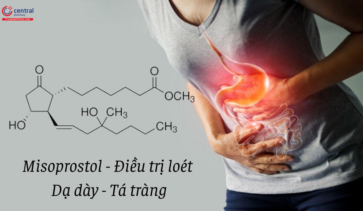 Misoprostol là chất tổng hợp có tác dụng tương tự prostaglandin E1 . Đối với dạ dày thuốc có hai tác dụng là ức chế bài tiết dịch vị và bảo vệ niêm mạc dạ dày, Misoprostol làm giảm bài tiết acid dạ dày do tác động trực tiếp tại các tế bào thành dạ dày, ức chế tiết lượng acid cơ bản và cả khi bị kích thích bởi thức ăn, histamin, pentagastrin, tetragastrin, betazol, NSAID, rượu hoặc Cafein. Misoprostol ức chế tiết acid dạ dày vào ban đêm, nhưng không làm giảm thể tích bài tiết. Misoprostol còn làm tăng tiết bicarbonat và dịch nhảy từ các tế bào không phải tế bào thành ở dạ dày, tăng cường hoặc duy trì dòng máu của niêm mạc, bảo vệ sự tăng sinh tế bào dưới niêm mạc, làm vững bền hệ thống màng nhày, phòng ngừa sự phá hủy hàng rào chất nhày, ức chế hoặc làm giảm sự khuếch tán trở lại của ion hydrogen vào trong niêm mạc. Misoprostol được dùng để điều trị ngắn hạn các trường hợp loét dạ dày - tá tràng. Tuy nhiên, do hiệu quả giảm đau kém và nhiều ADR, misoprostol không phải là thuốc được lựa chọn chính cho chỉ định này. Hiện nay, misoprostol được dùng chủ yếu để dự phòng loét thường xảy ra khi điều trị dài hạn NSAID ở những người có nguy cơ cao.