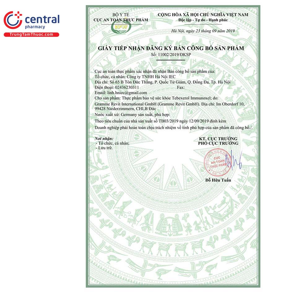 - Tebexerol Immunoxel đã được Bộ Y tế, Cục an toàn vệ sinh thực phẩm Việt Nam cấp giấy chứng nhận với số đăng ký là 15907/2013/ ATTP-XNCB 14/08/2013