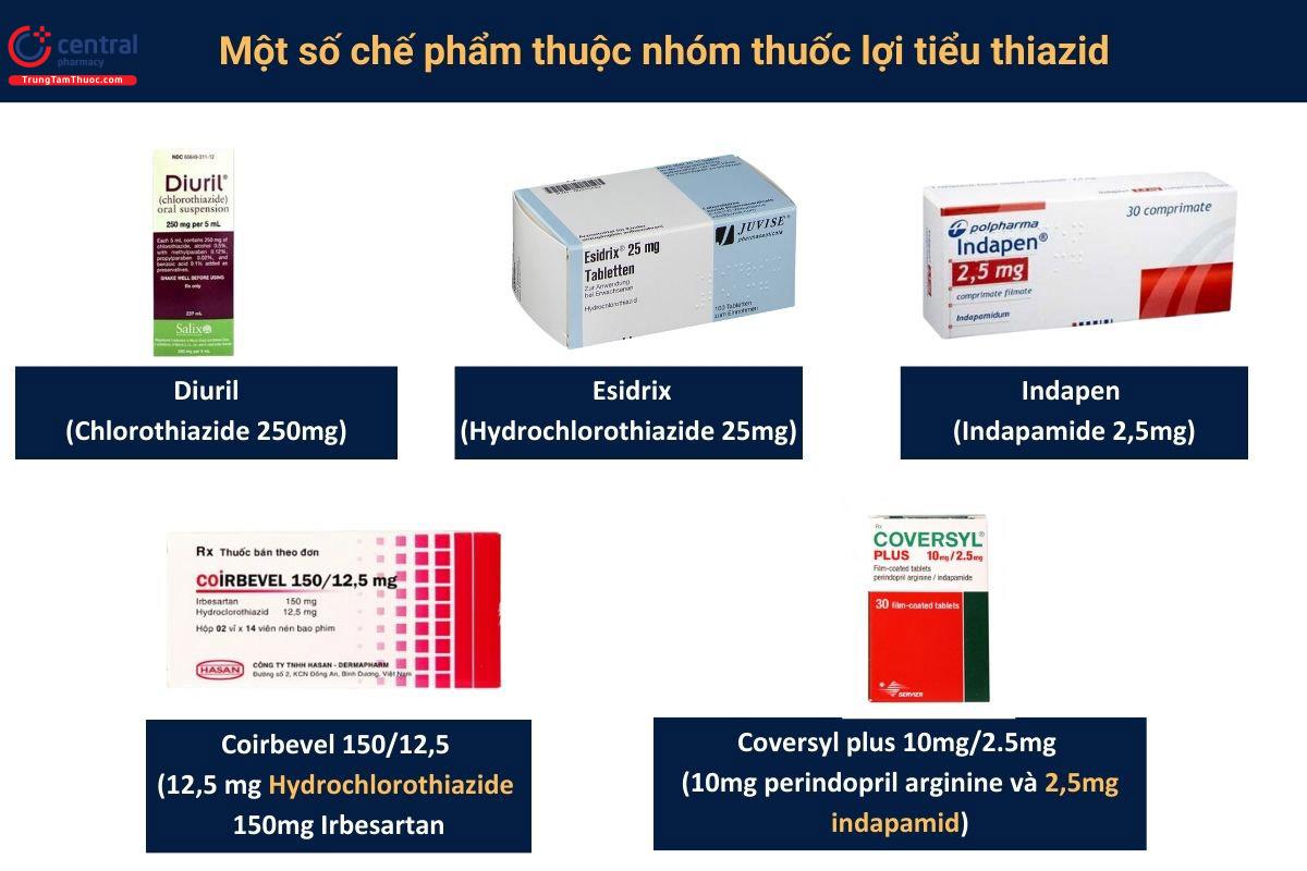 Hydrochlorothiazide (Esidrix, Hydrodiuril,...): uống 0,025 – 1g/ngày chia 2 lần.