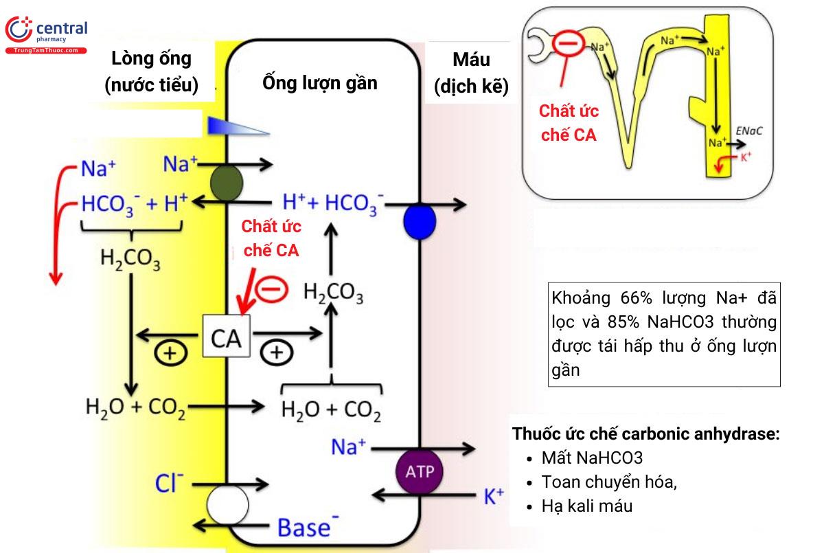 Khi enzyme CA bị ức chế, phản ứng giải phóng H+ từ H2CO3 cũng bị ức chế dẫn đến số lượng ion H+ trong các tế bào biểu mô ống lượn gần giảm hoặc không được giải phóng, vì vậy mà ion Na+ cũng giảm hoặc không được tái hấp thu, mà được thải ra ngoài nước tiểu, quá trình này kéo theo nước nên có tác dụng lợi tiểu. Bên cạnh đó, quá trình này còn có sự tranh chấp bài xuất giữa H+ và K+ nên khi thiếu H+ thì K+ tăng thải trừ và hạn chế chuyển NH3 thành NH4+. Như vậy, thuốc ức chế CA làm tăng thải trừ các loại ion K+, Na+ và HCO3- qua nước tiểu và làm giảm lượng ion K+ trong máu. Nếu dùng thuốc kéo dài có thể gây nhiễm toan chuyển hóa do đào thải quá mức HCO3- vào trong nước tiểu.