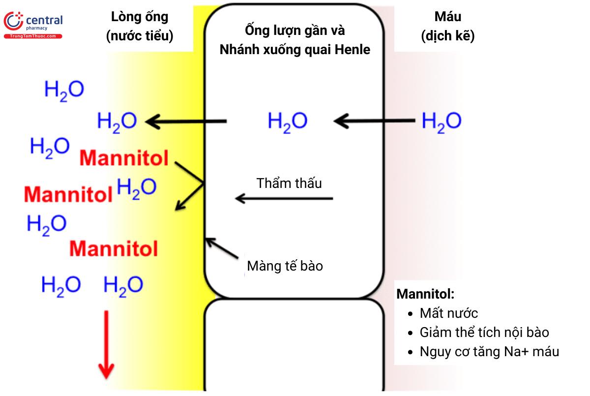 | Thuốc lợi tiểu thẩm thấu | Thẩm thấu (tăng bài tiết nước) | Không xác định | Ống lượn gần Nhánh xuống mỏng quai Henle Ống góp | Tăng | Suy thận cấp Phù não Tăng nhãn áp | Mannitol (Osmitrol,..) |