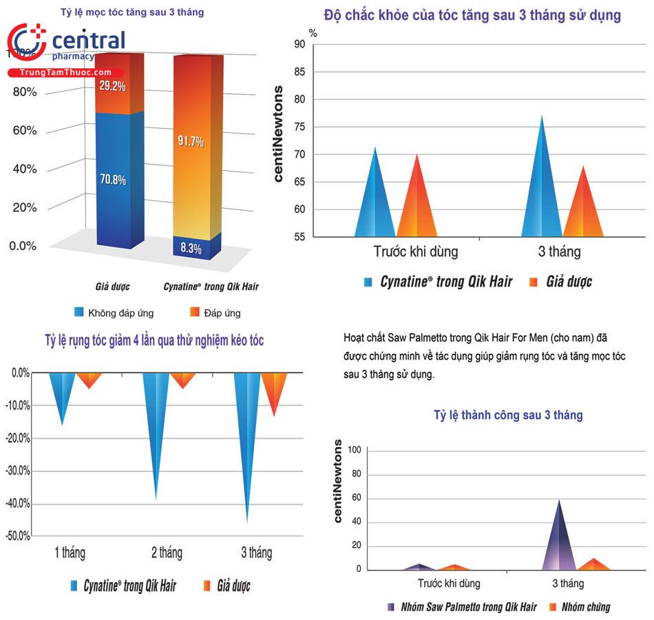 Công thức Cynatine trong Qik Hair đã được nghiên cứu lâm sàng tại Đại học Paniva. Kết quả nghiên cứu cho thấy người dùng giảm tình trạng rụng tóc đáng kể sau 4 tuần, đồng thời 91,7% người sử dụng mọc nhiều tóc con sau 3 tháng - một con số hết sức ấn tượng. Không chỉ vậy, những người tham gia cũng nói rằng tóc học được cải thiện nhiều về độ chắc khỏe.