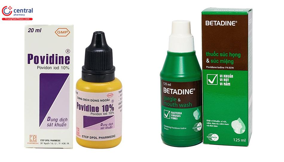 | Povidone Iod | Dẫn chất của Iod | Vi khuẩn, nấm, lao và virus | Bị phân hủy bởi ánh sáng | Sát trùng da, niêm mạc, vết thương hở, bỏng nhẹ; khử trùng dụng cụ y tế; sát trùng cuống rốn, mắt | Thuốc sát trùng Betadine, PVP – Iodine 10%, Iodine, Povidon 10%, Povidon iod 10%, Povidone Iodine 10%, Wokadine 10% Dung dịch súc miệng Povidine Iod 1%, Betadine Gạc đắp vết thương Povidine 10% |