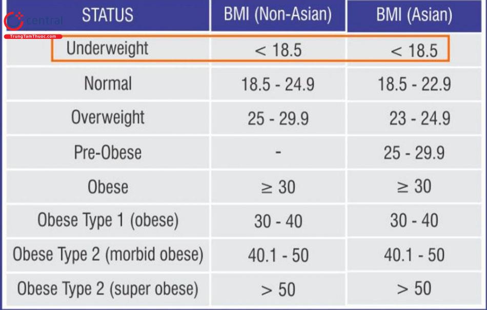 - Một người bị coi là thiếu cân khi chỉ số BMI < 18.5