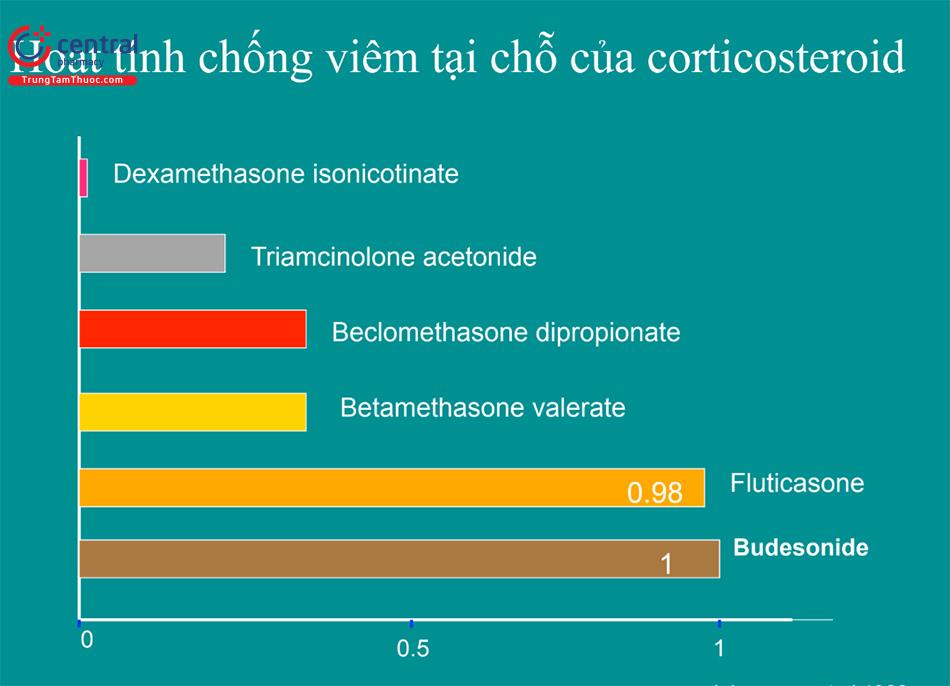 Tác dụng chống viêm của corticoid trong hen phế quản tốt, cho tác dụng giảm tần suất và mức độ nặng cơn hen, cải thiện chức năng hô hấp và chất lượng cuộc sống. Các corticoid này phù hợp với điều trị các thể hen phế quản kéo dài, có mối tương quan về hiệu quả - liều điều trị (trừ những trường hợp đợt hen nặng).
